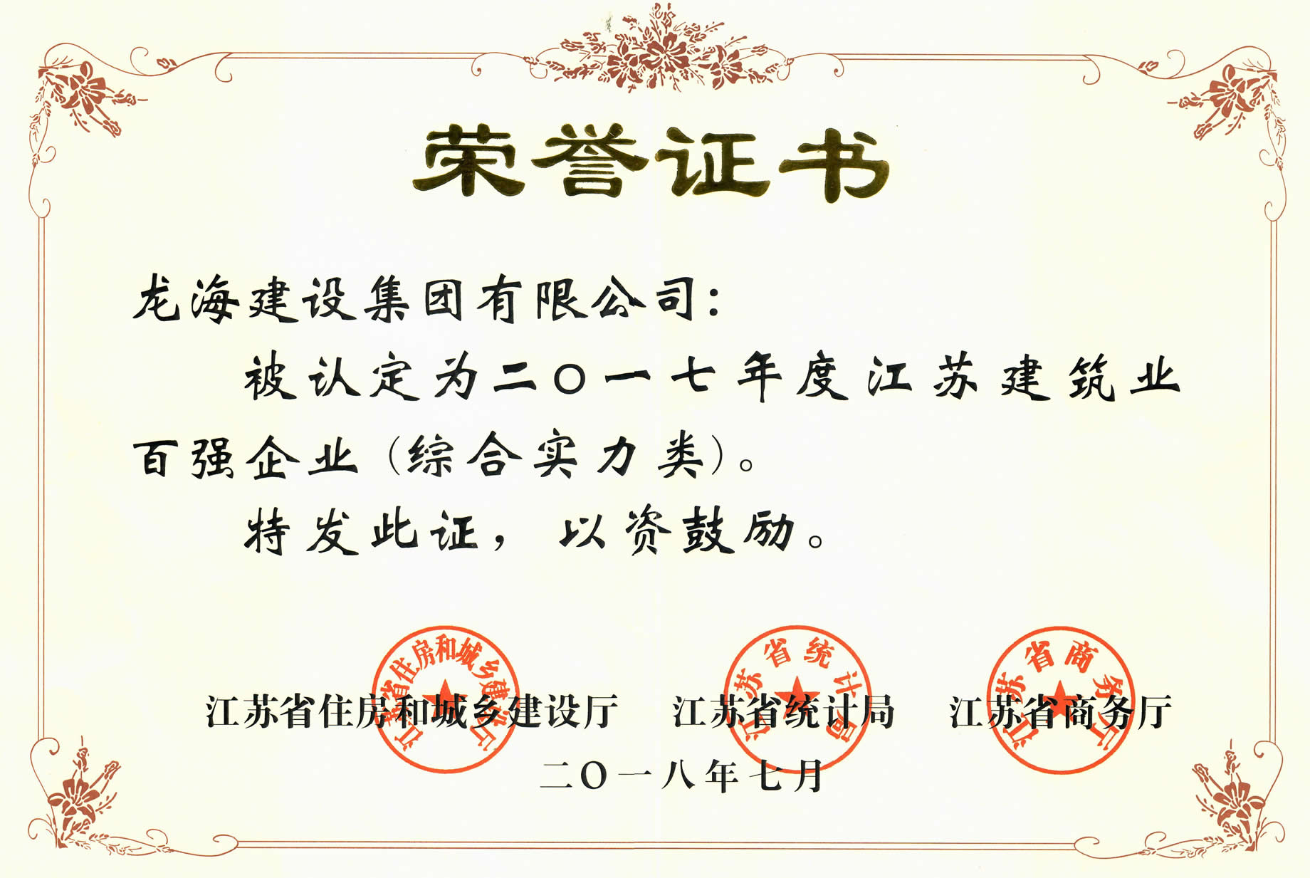 為充分發(fā)揮優(yōu)勢骨干企業(yè)在全行業(yè)中的示范引領(lǐng)作用,打造企業(yè)品牌形象,省住房城鄉(xiāng)建設(shè)廳、統(tǒng)計局、商務(wù)廳成立了“百強(qiáng)企業(yè)”認(rèn)定委員會,并按照有關(guān)程序,組織開展了2017年度建筑業(yè)“百強(qiáng)企業(yè)”認(rèn)定活動。經(jīng)評審,集團(tuán)公司脫穎而出,被授予“2017年度江蘇省建筑業(yè)百強(qiáng)企業(yè)(綜合實(shí)力類)”榮譽(yù)稱號,位列第二十二。按照《江蘇省建筑業(yè)企業(yè)信用綜合評價辦法》(蘇建建管〔2016〕82號)文件精神,自發(fā)布之日起的一年內(nèi),“百強(qiáng)企業(yè)”可在施工企業(yè)信用考評中作為省級獎勵予以加分。